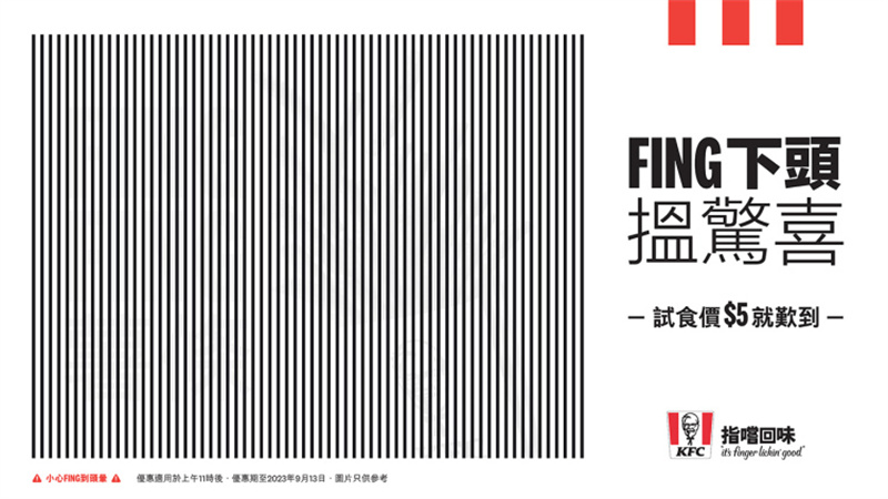 大家的搖頭晃腦是因?yàn)檫@是一塊搖頭才能看見的趣味廣告牌——肯德基利用光柵成像原理,即快速搖頭或圖像移動(dòng)增加視覺信息編碼,讓隱藏在粗細(xì)不同的黑線中的圖像和信息浮現(xiàn)出來。讀到這里我們也可以嘗試一下,只要要搖頭搖得夠快就能看到這次廣告的主角:薯?xiàng)l。